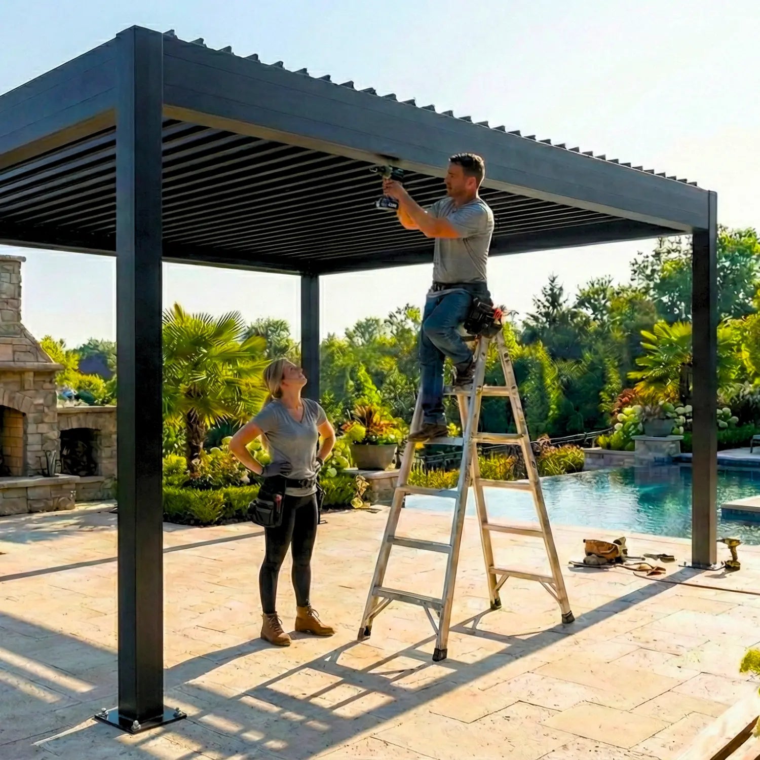 We designed this as a DIY-friendly pergola kit for homeowners. While professional installation is always an option, two handy adults can typically assemble the structure in a single weekend (approx. 4–6 hours). The kit comes with pre-drilled holes, clearly labeled parts, and an easy-to-follow manual, saving you the cost of hiring a contractor.