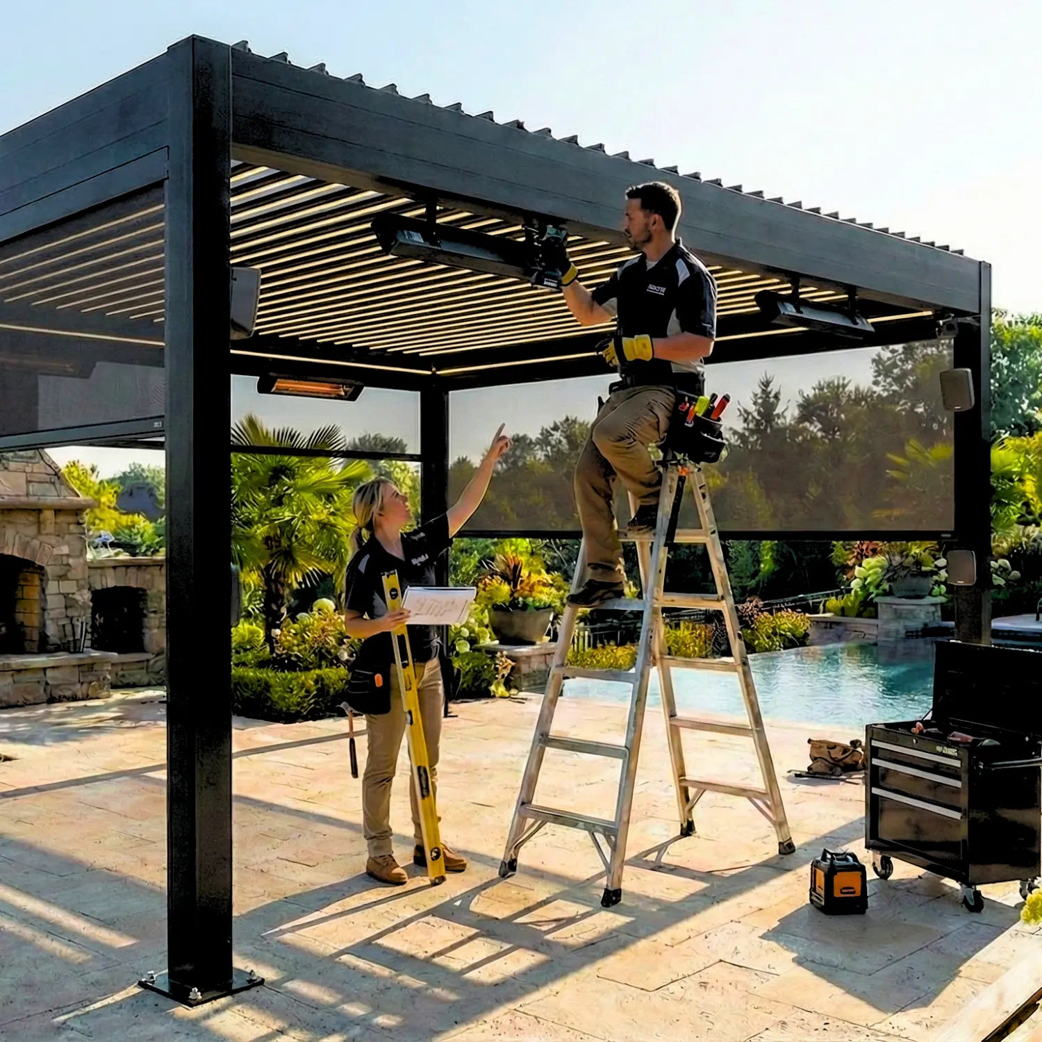 Aluminum pergolas offer significant advantages over wood. While wood can rot, warp, and requires annual staining, our powder-coated aluminum is rust-resistant, termite-proof, and virtually maintenance-free. It provides a sleek, modern aesthetic that lasts for decades without the fading or peeling associated with wooden structures.