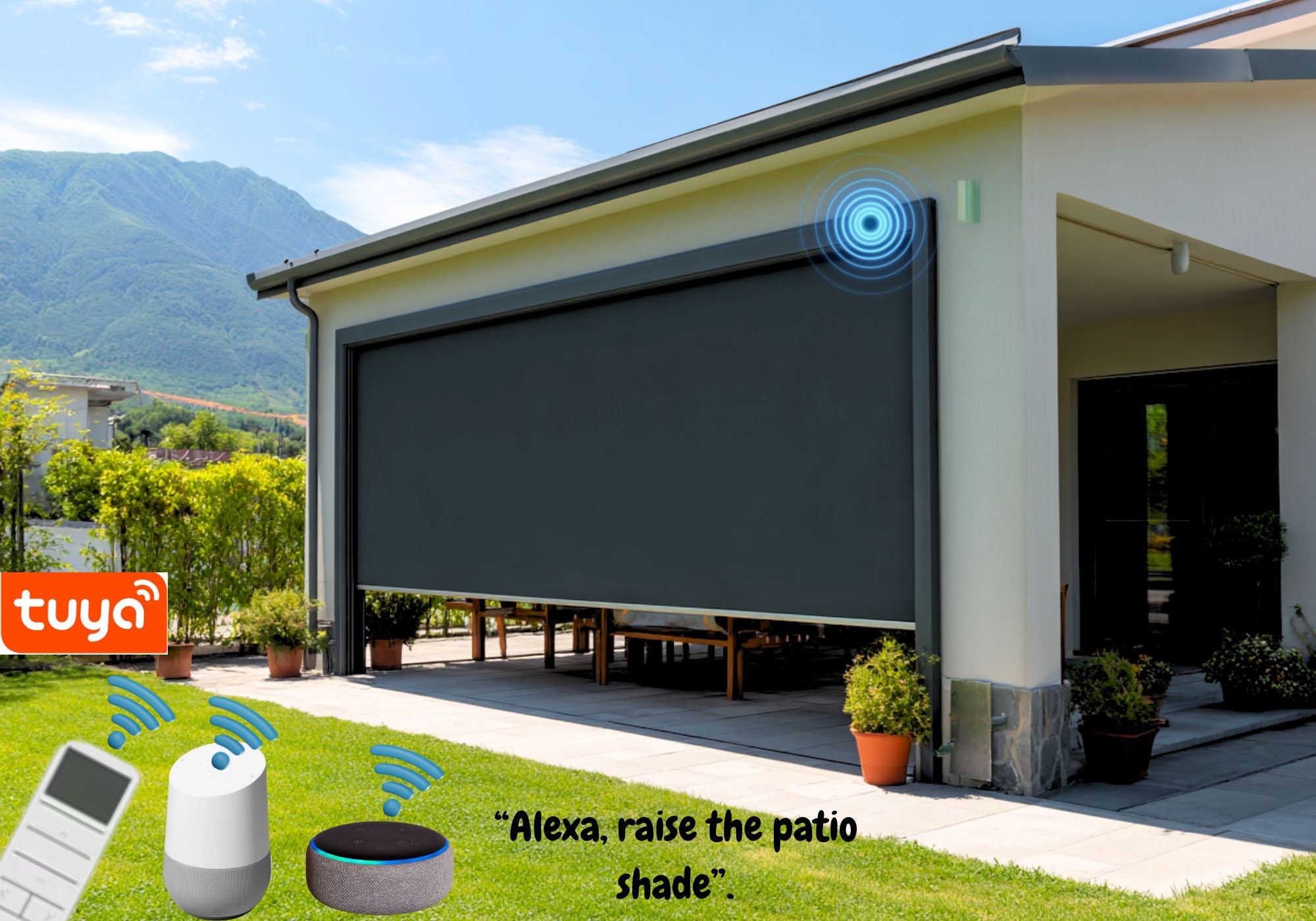 Our premium motor connects by Wi-Fi and works with Amazon Alexa, Google Assistant, and the Tuya app—so you can control your exterior shades by voice, from your phone, or with schedules and automations from anywhere.